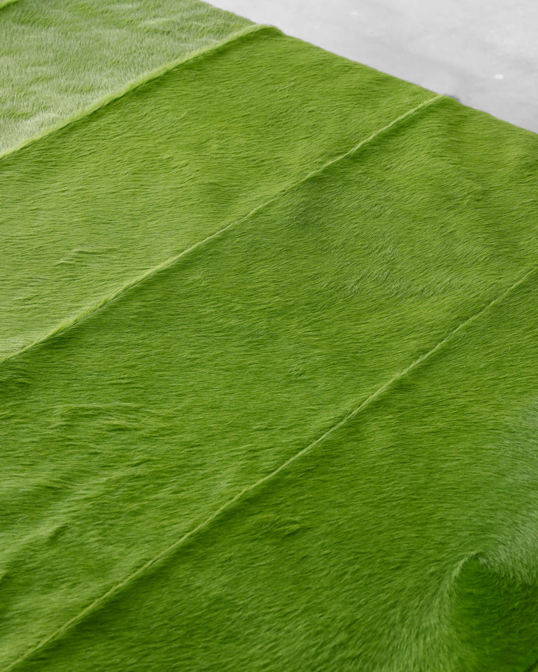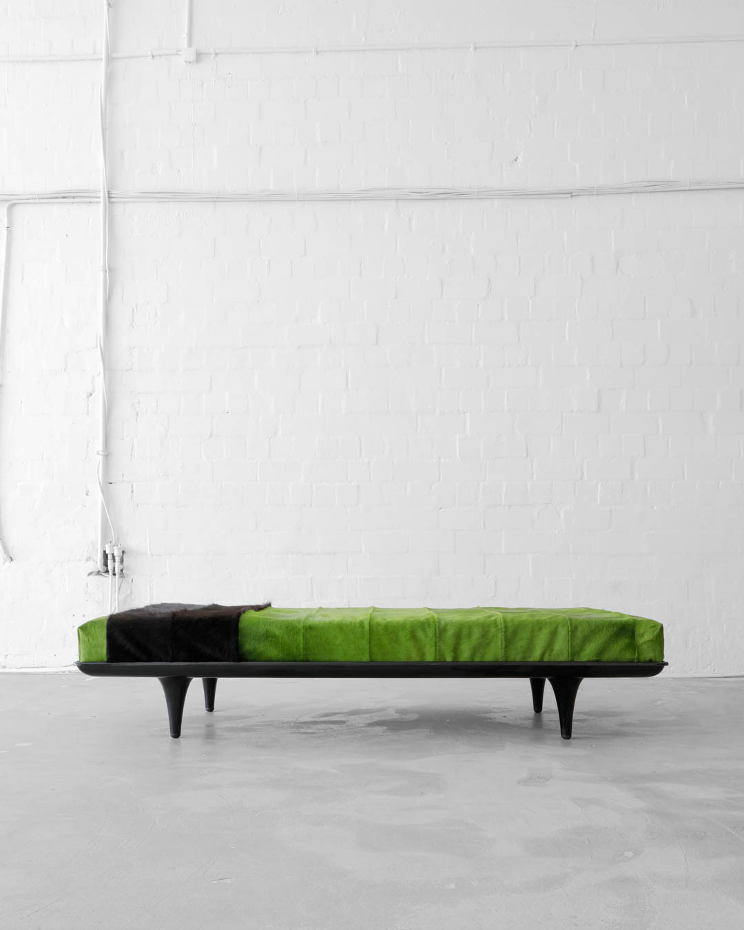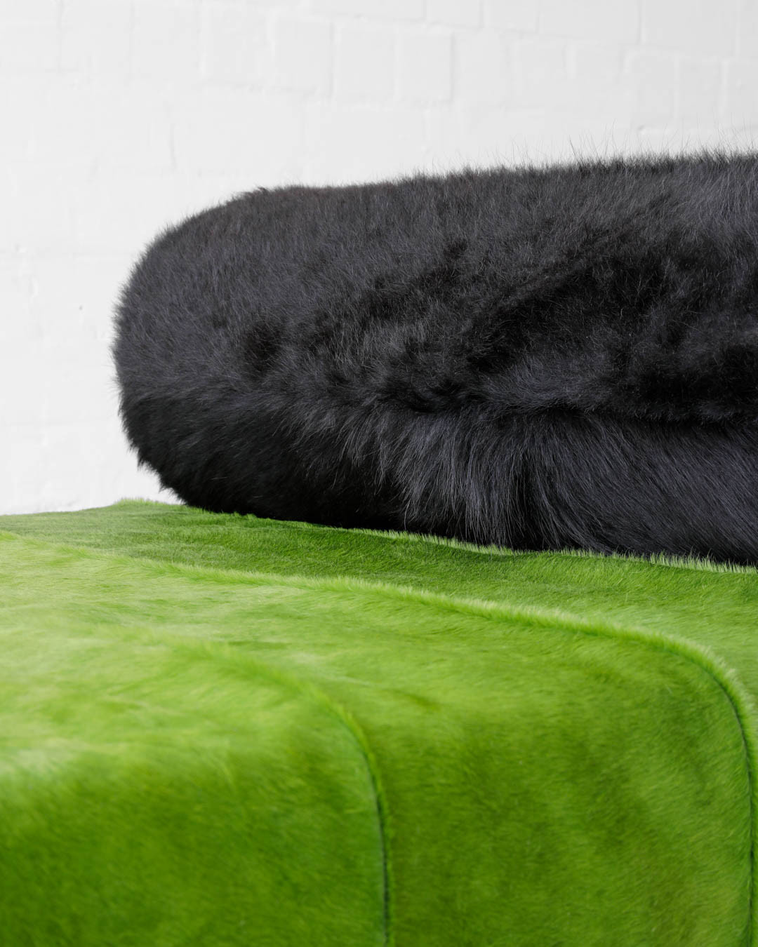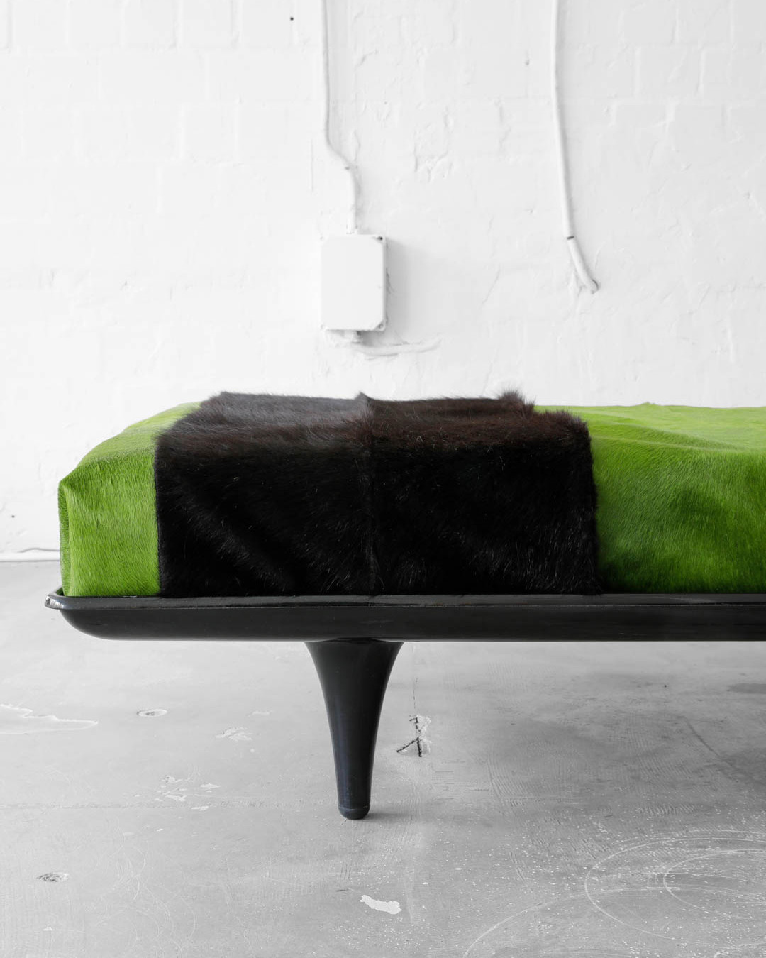 Refurbished by FREIKOERPER with remnants cowhide leather, featuring bold green and black tones, plus a matching roll cushion, it blends timeless design with a contemporary touch.