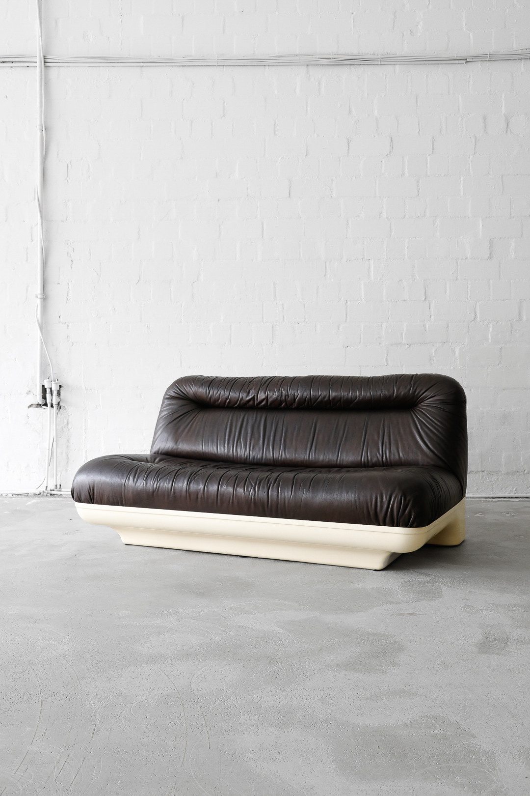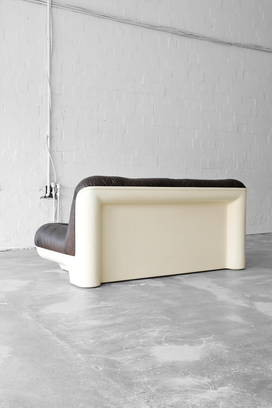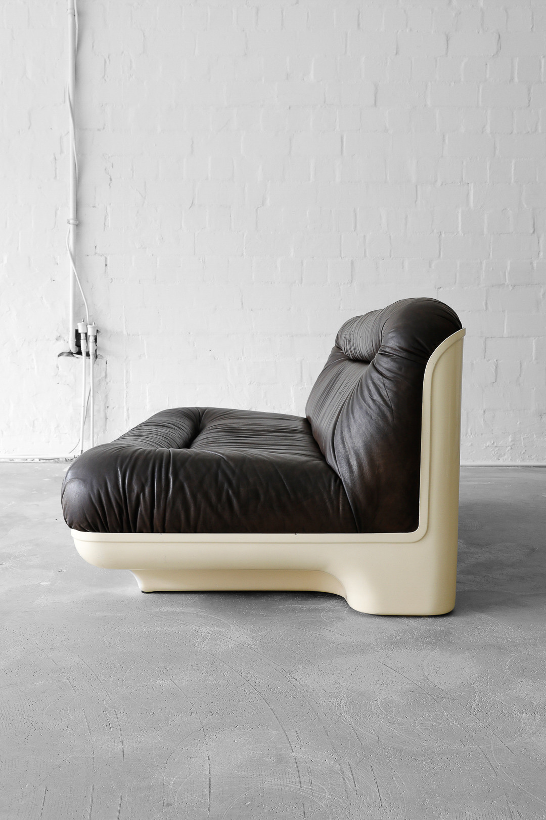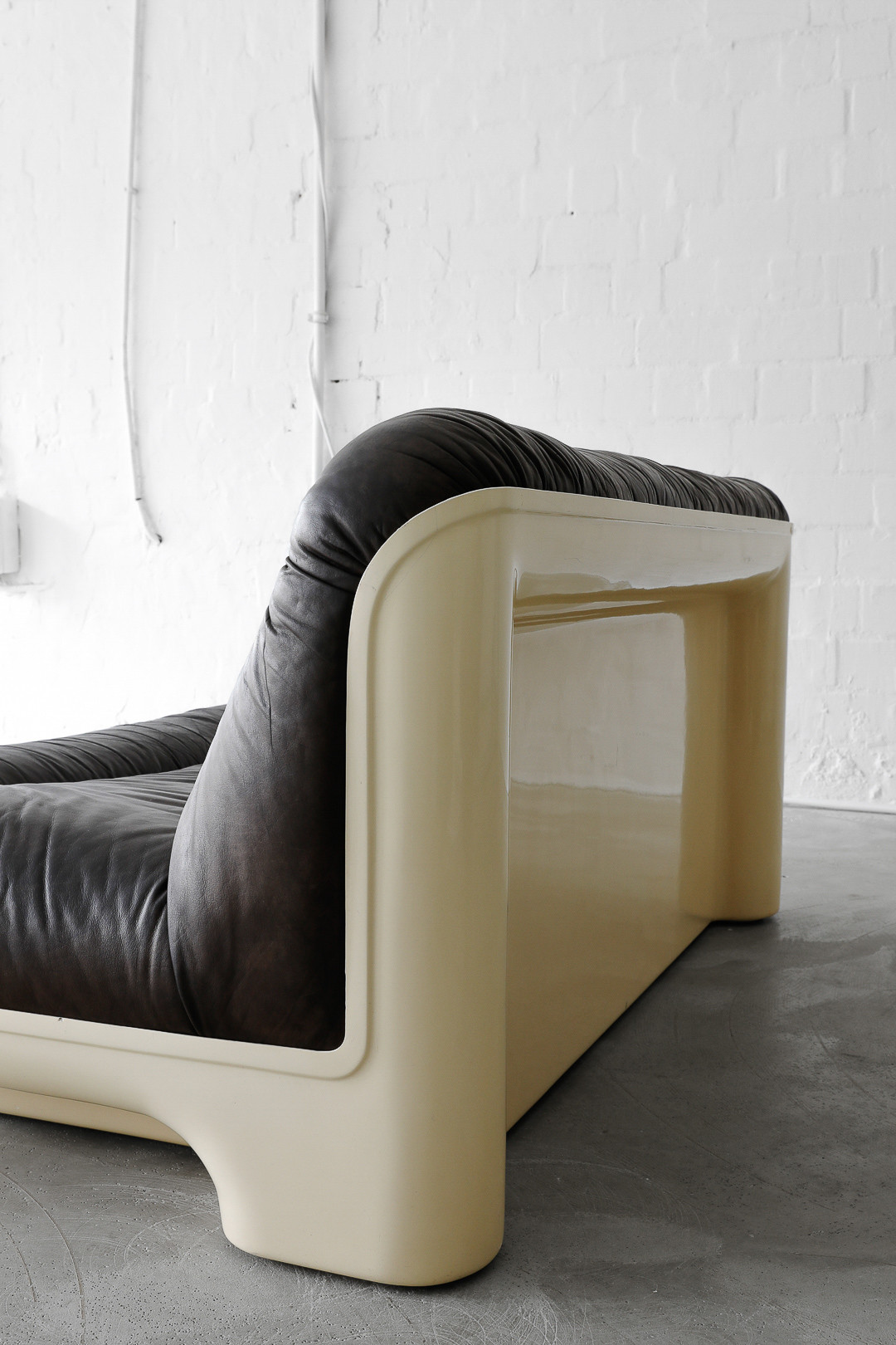 This is a very unique and super rare sofa with matching coffee table, designed and produced from one of our favourite designers Gerd Lange in the 70s. The sofa is made of thick brown buffalo leather in a beautiful glass fiber reinforced polyester shell. The matching coffee table is also produced of glass fiber reinforced polyester. In beautiful vintage condition.
