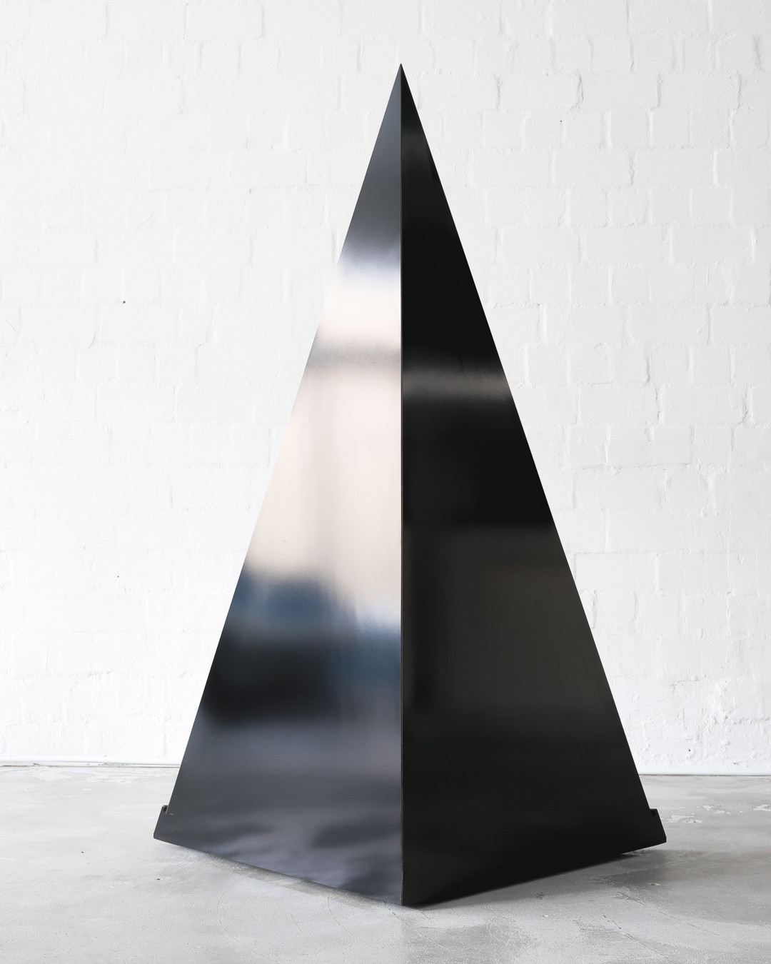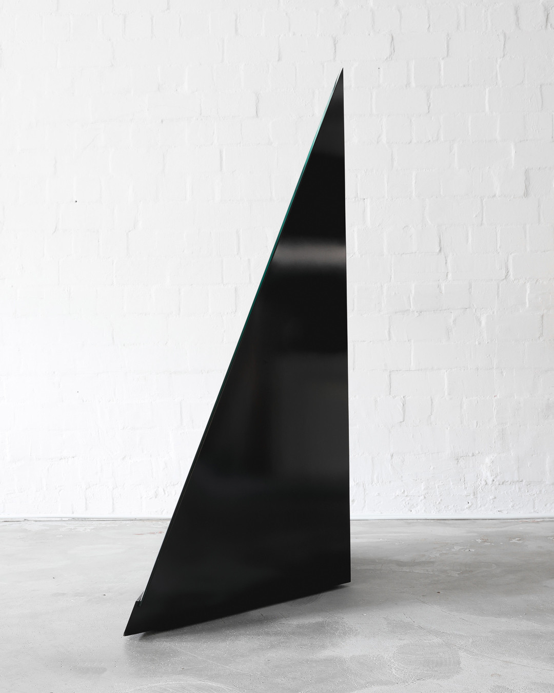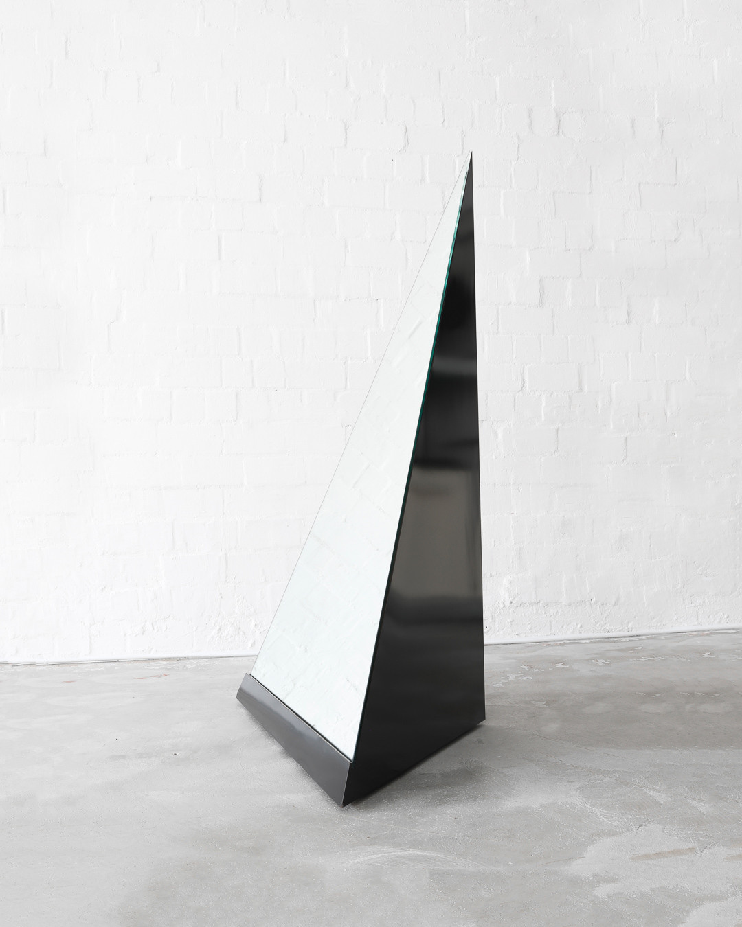 Large floor mirror designed by Giuseppe Raimondi in the 70's, manufactured by Cristal Art. Pyramidal structure in black lacquered wood and covered with black laminated sides. It is mounted on wheels to make it easy to move. Good general condition, minor cracks to the front corners.