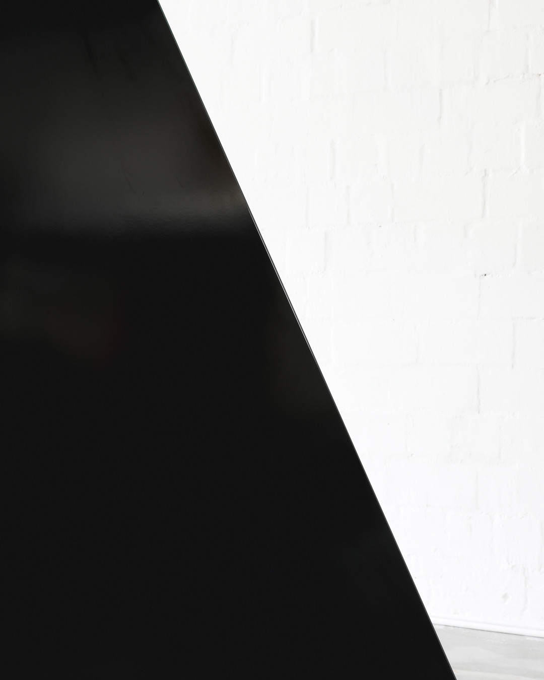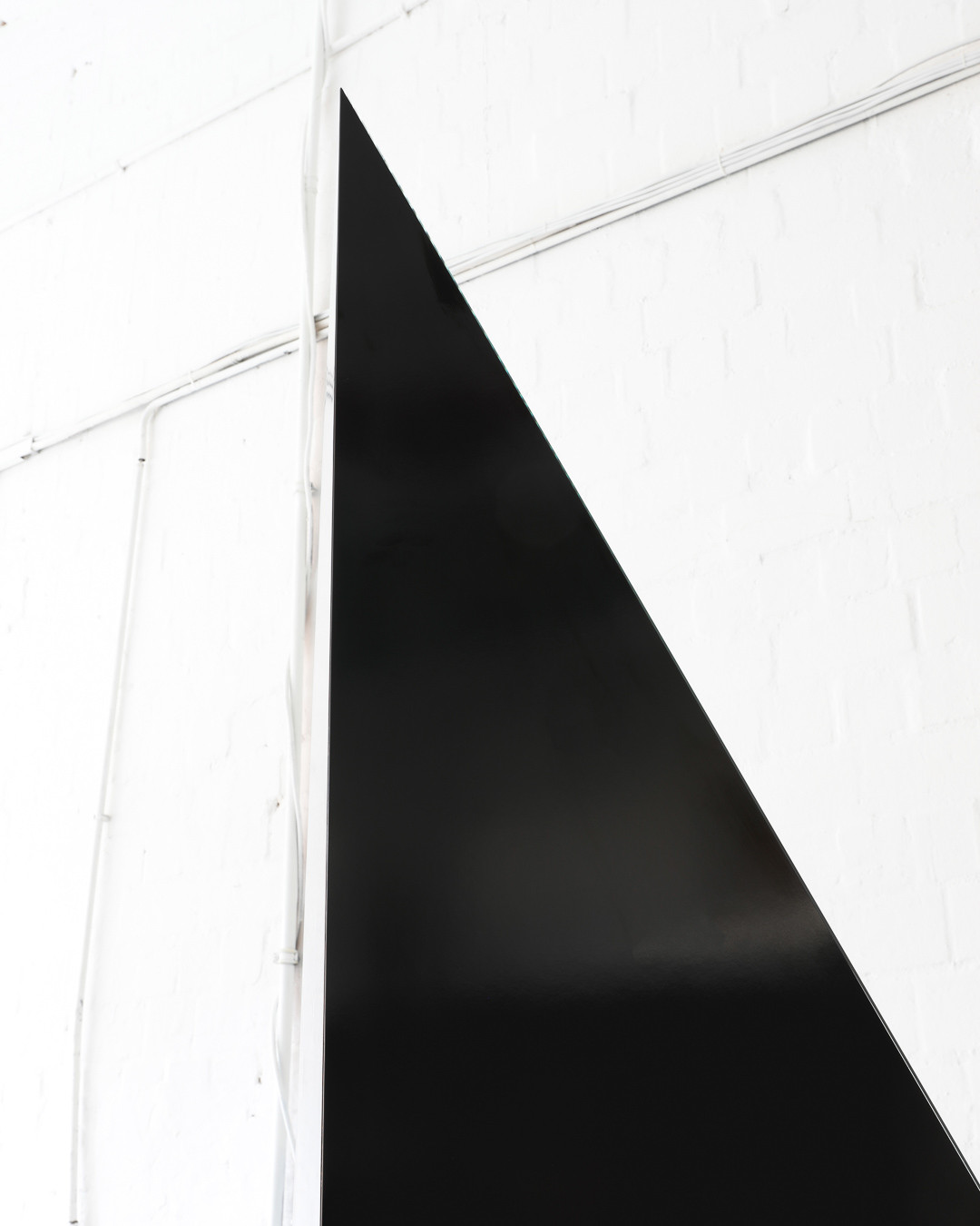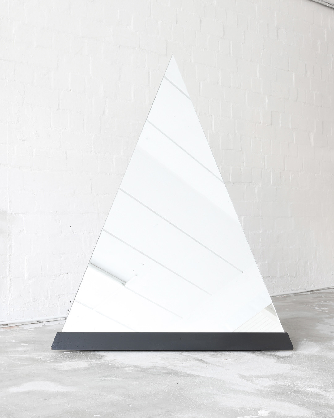 Large floor mirror designed by Giuseppe Raimondi in the 70's, manufactured by Cristal Art. Pyramidal structure in black lacquered wood and covered with black laminated sides. It is mounted on wheels to make it easy to move. Good general condition, minor cracks to the front corners.