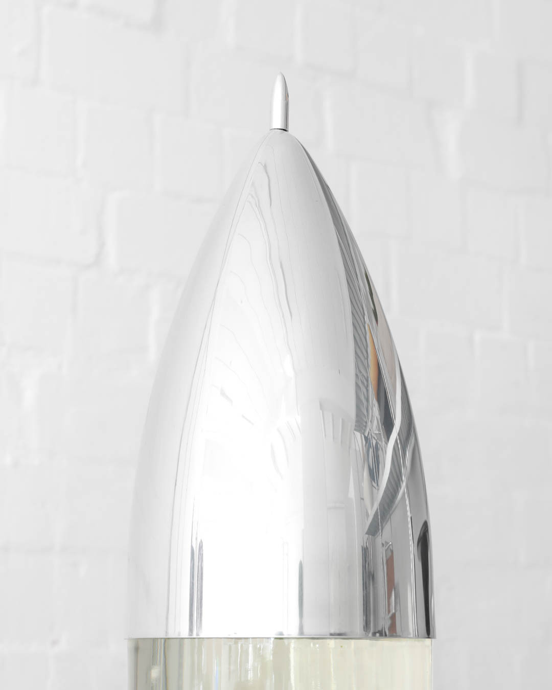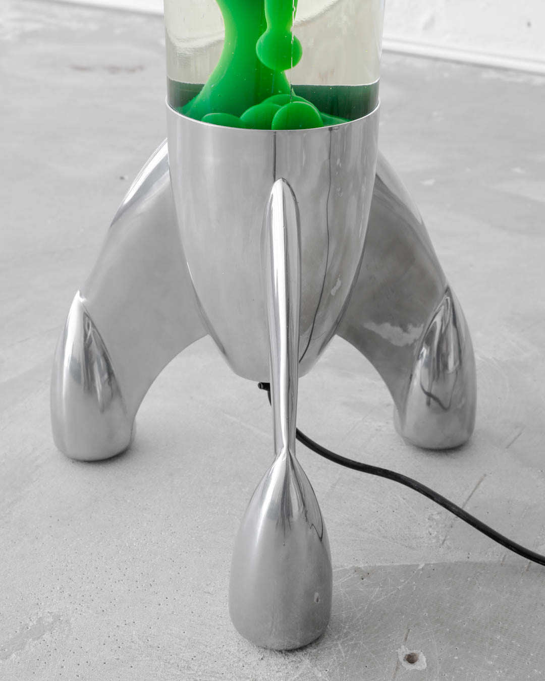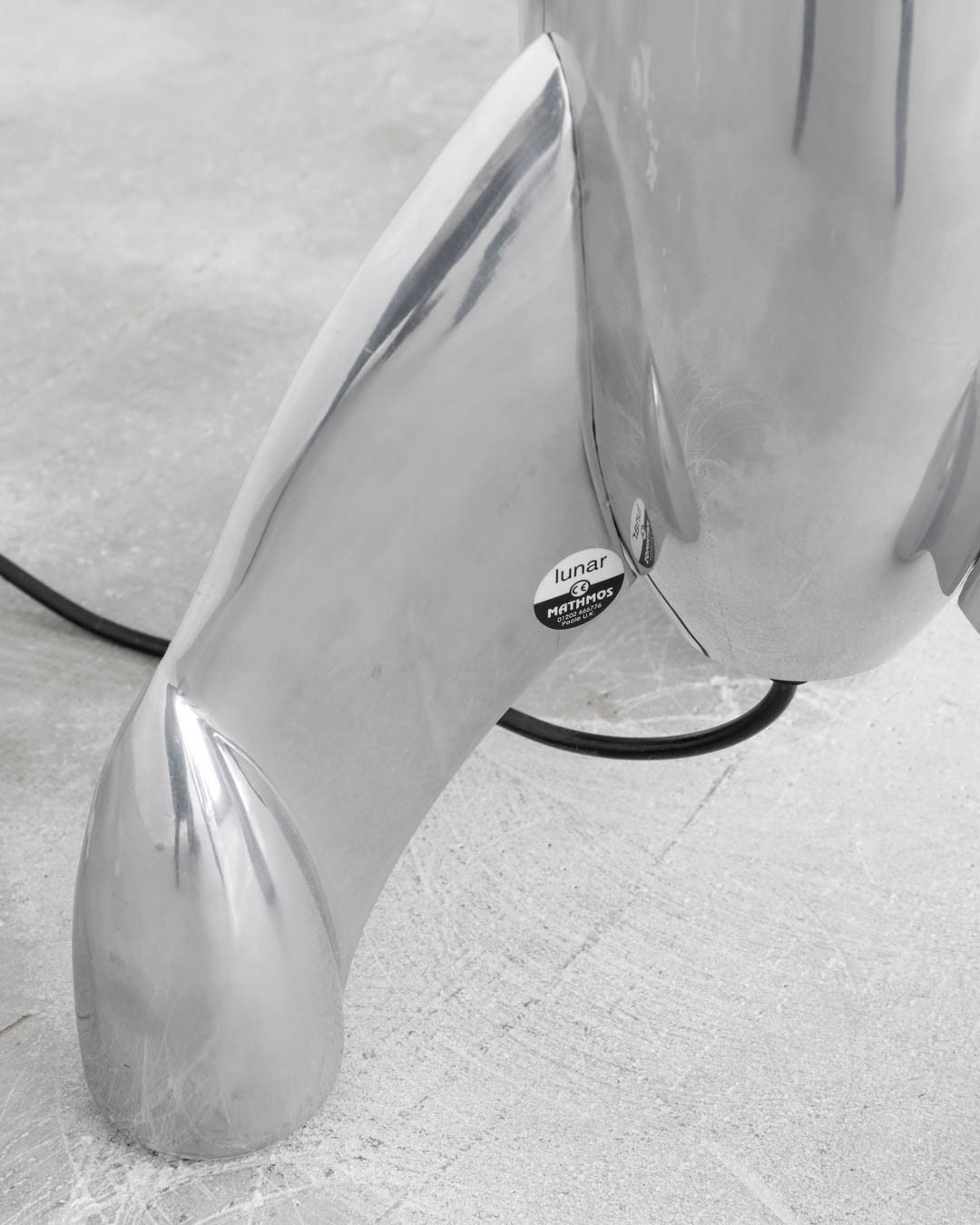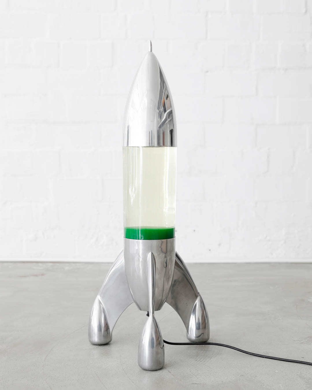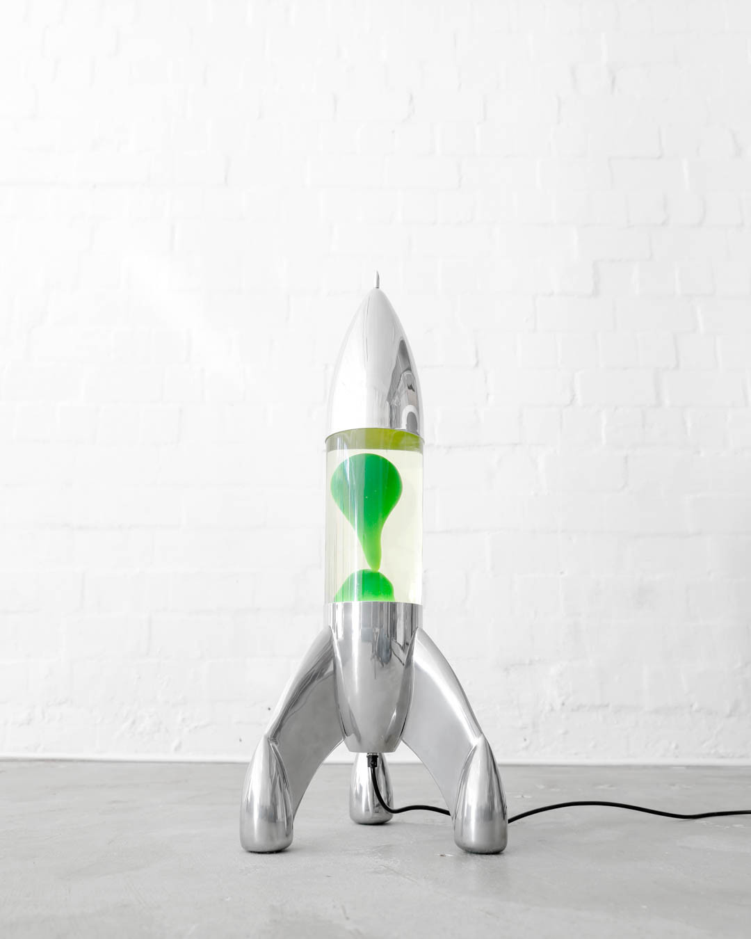 Huge “Lunar” Lava Lamp by Mathmos, England, 1990s. Crafted from chromed metal and featuring a striking green liquid, this lamp is an exceptionally rare find. Inspired by Tintin’s iconic moon landing adventure, it stands as a favorite among collectors and space-age design enthusiasts alike. Dimmable light switch.