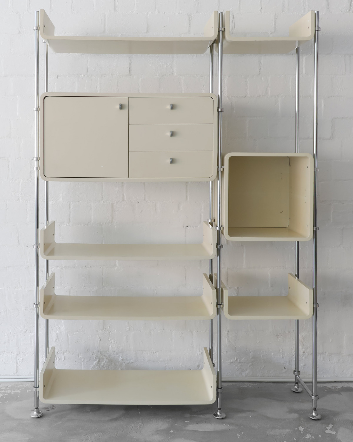 Stunning modular wall unit, either placed in front of a wall or as a room divider free standing, it’s an absolute masterpiece! Ivory lacquered wood, combined with steel construction, 1970s. In used vintage condition with scratches.