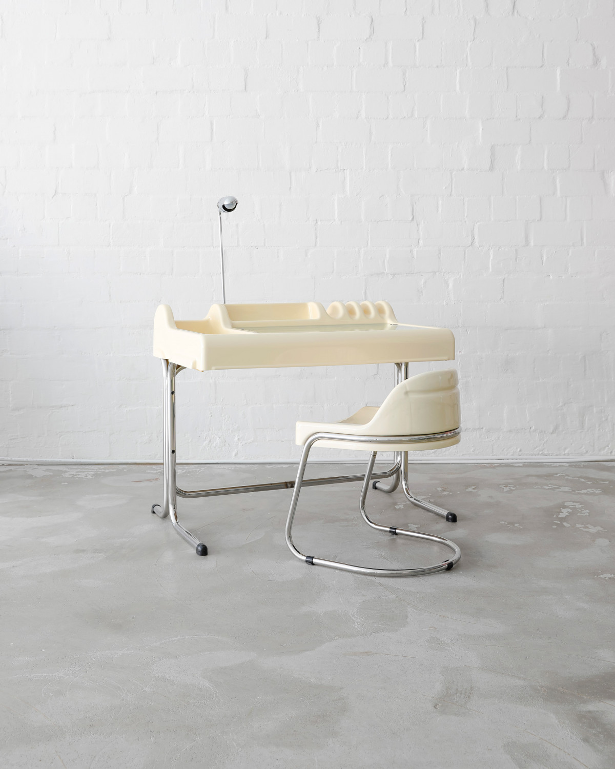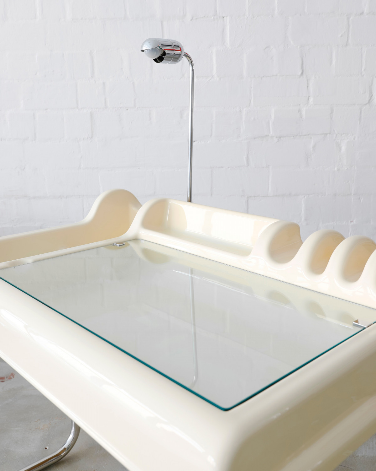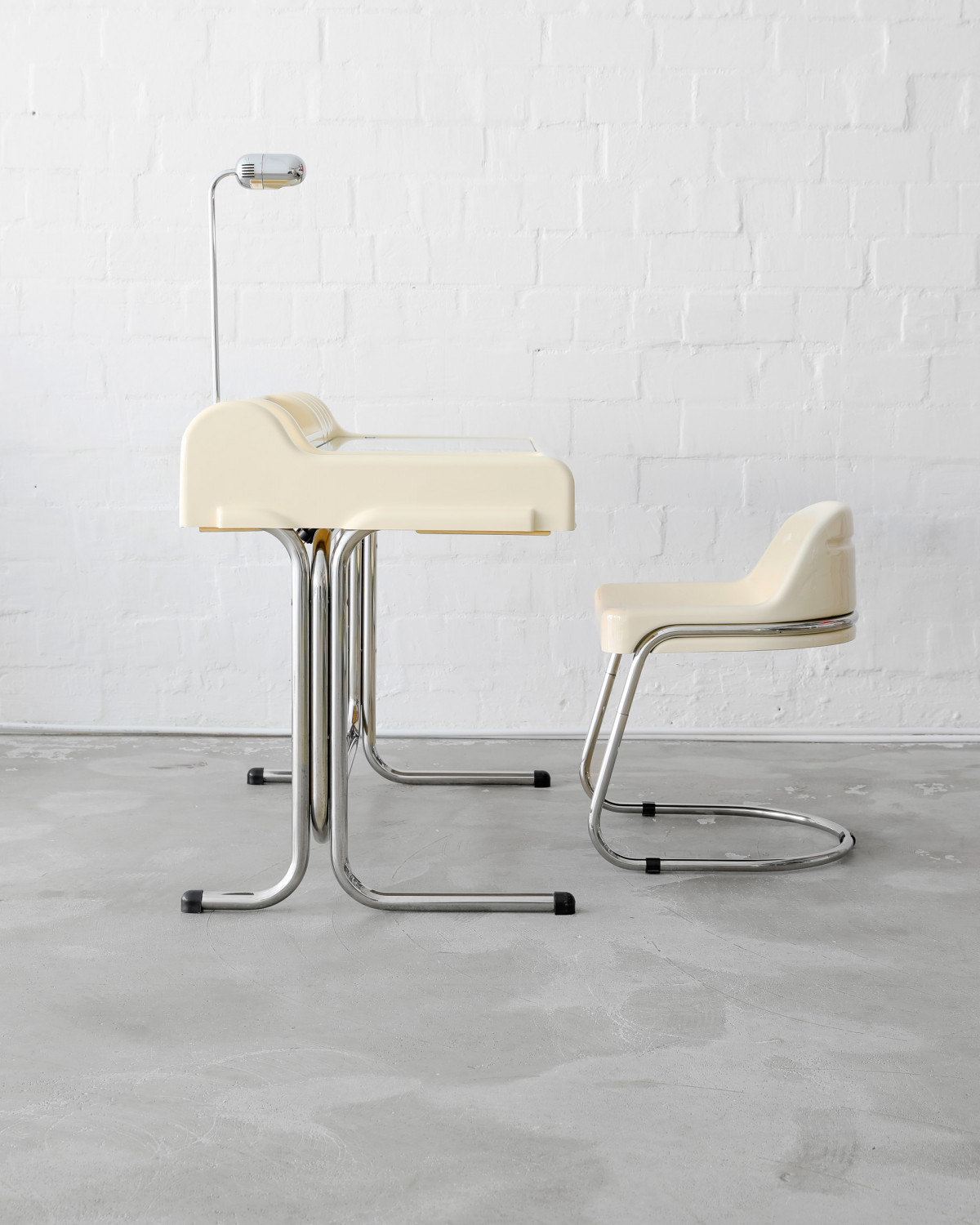 Rare Butter Yellow „Orix“ desk and chair for Molteni, designed by Vittorio Parigi & Nani Prina in 1970. Fancy piece of space age design, molded from a single sheet of plastic, with built-in brackets, storage compartments, a lift-up glass panel, and a retractable desk lamp.