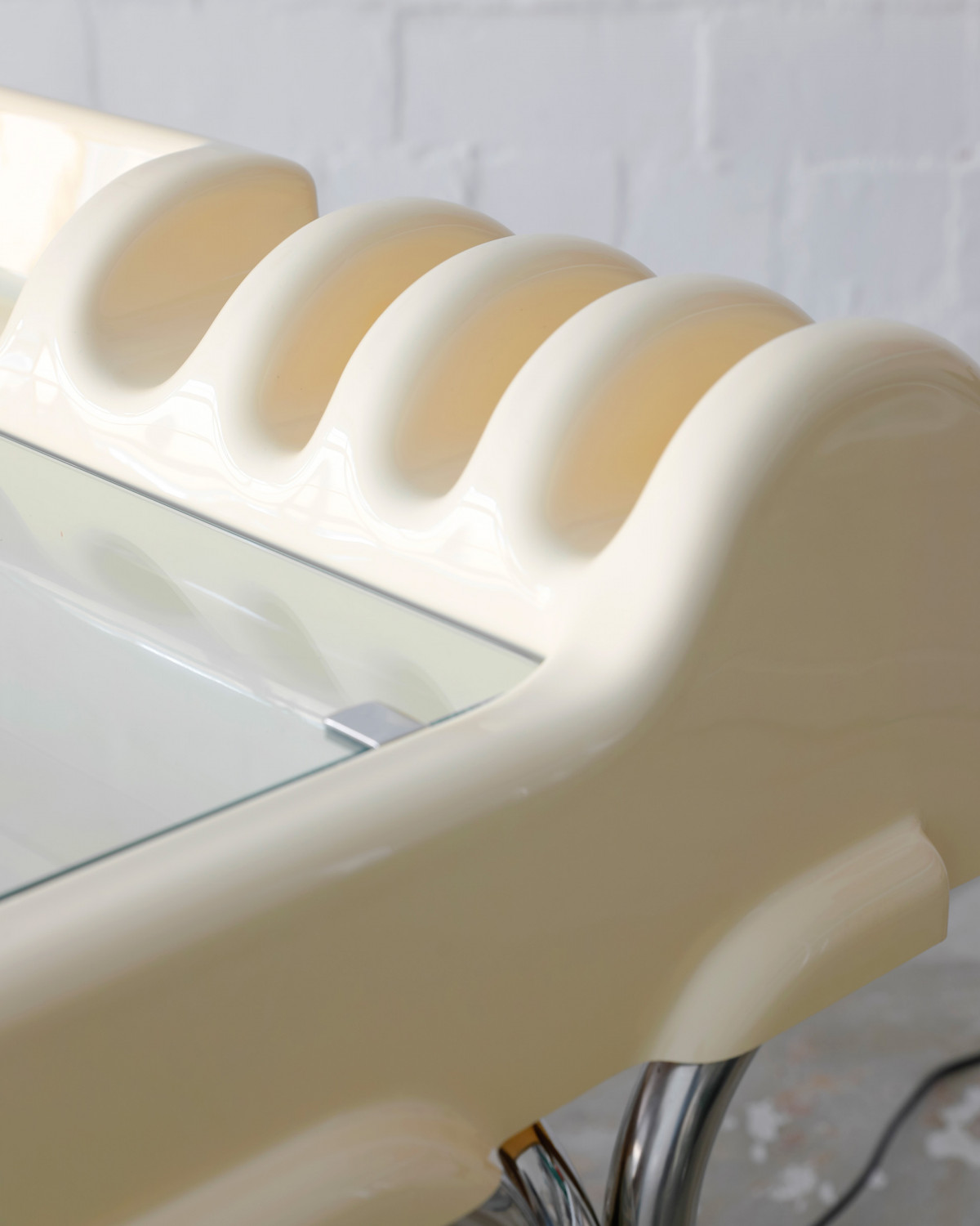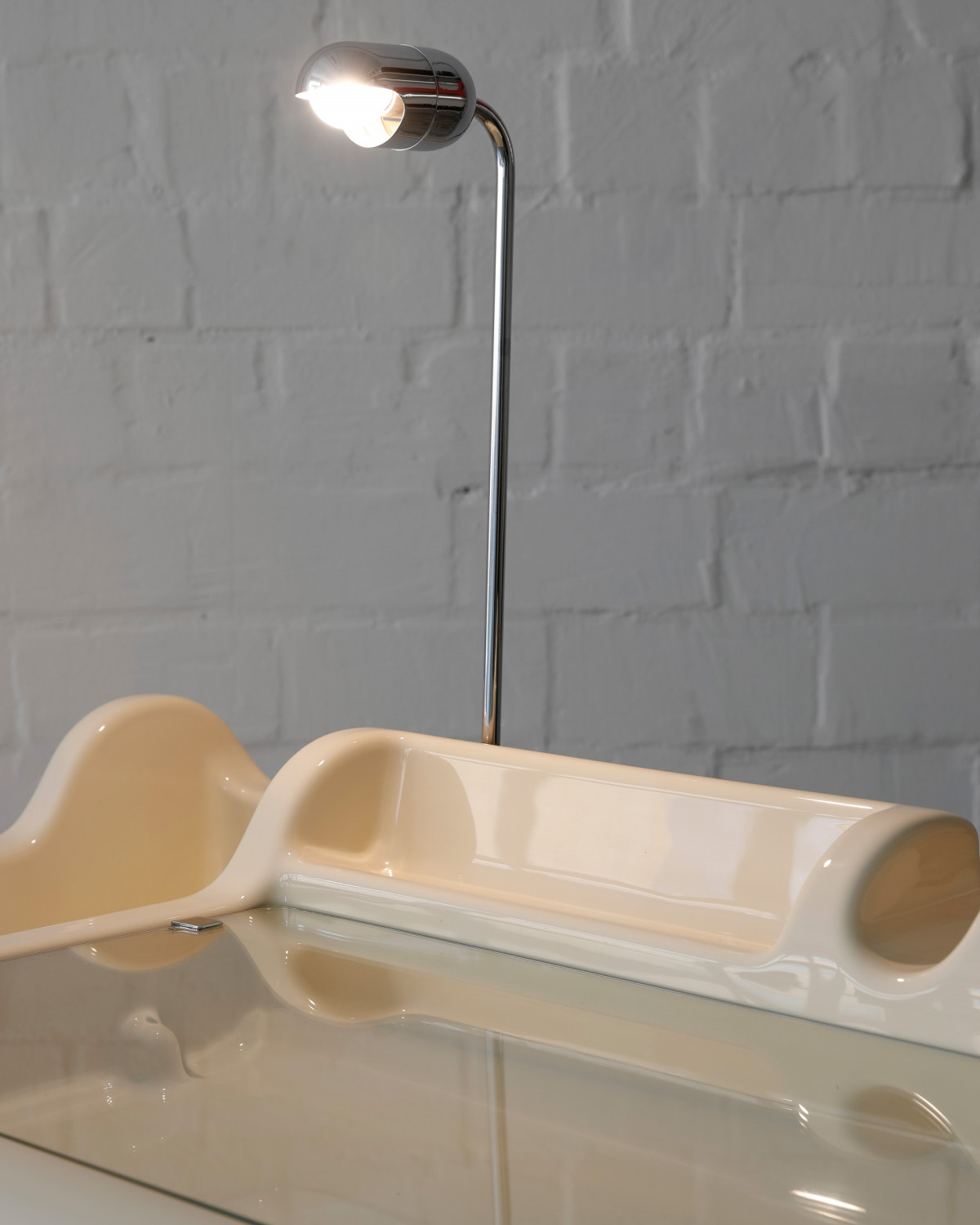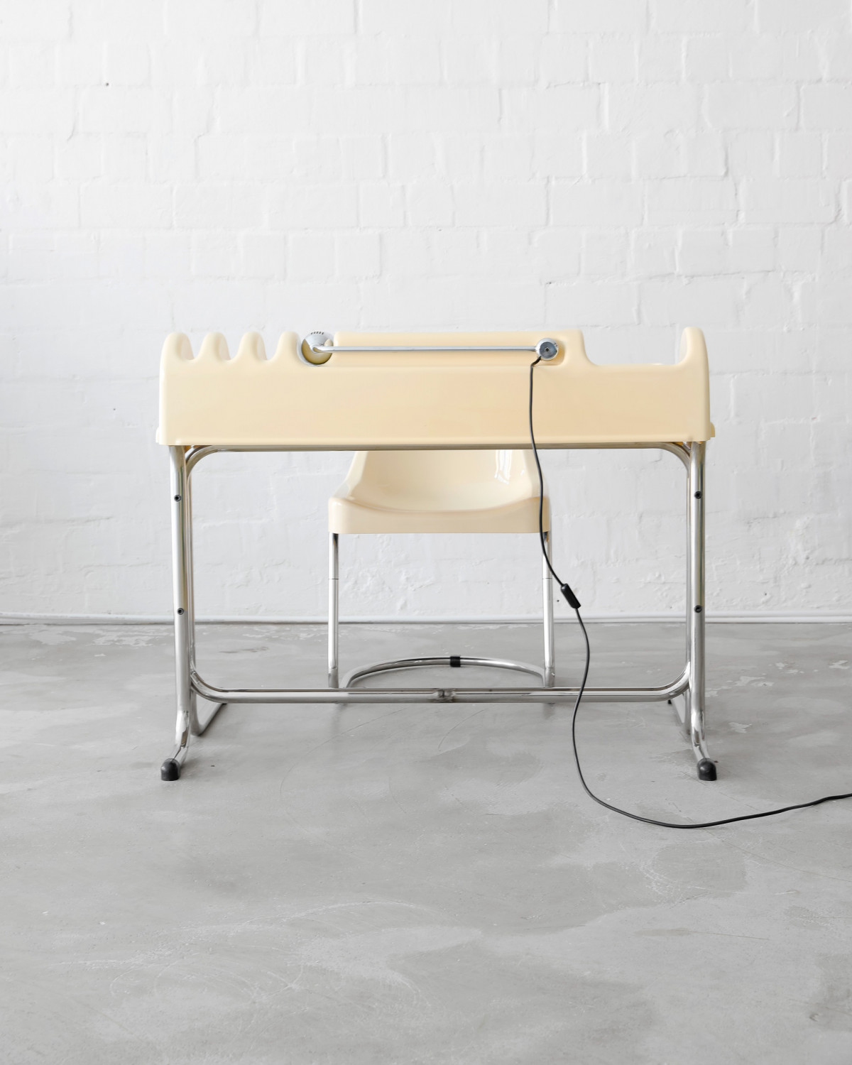 Rare Butter Yellow „Orix“ desk and chair for Molteni, designed by Vittorio Parigi & Nani Prina in 1970. Fancy piece of space age design, molded from a single sheet of plastic, with built-in brackets, storage compartments, a lift-up glass panel, and a retractable desk lamp.