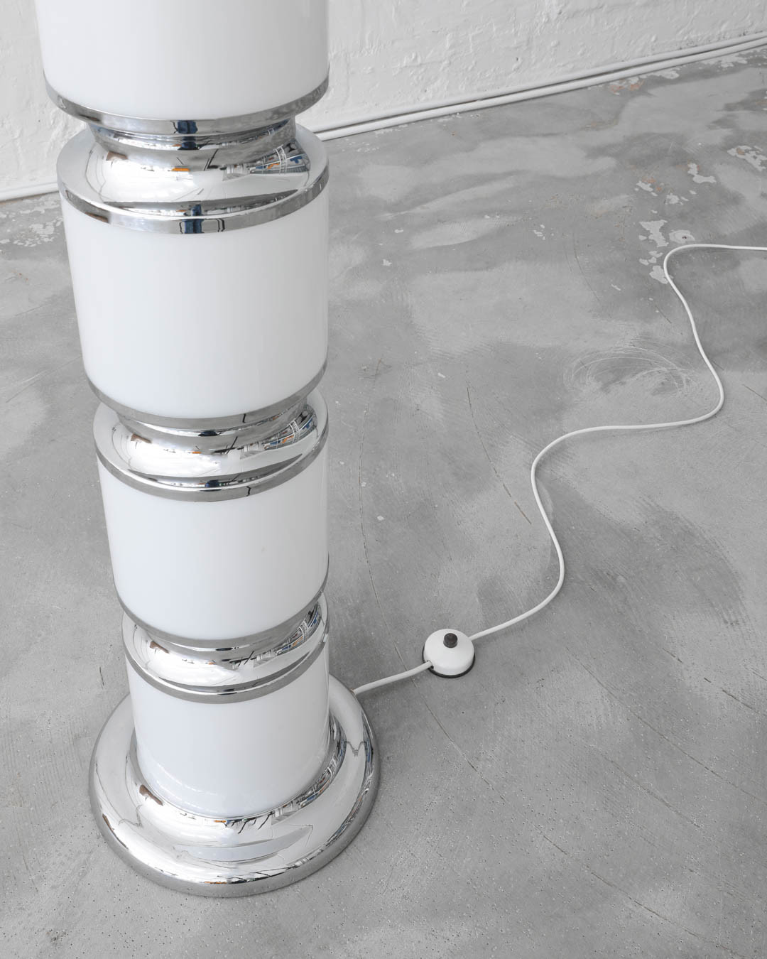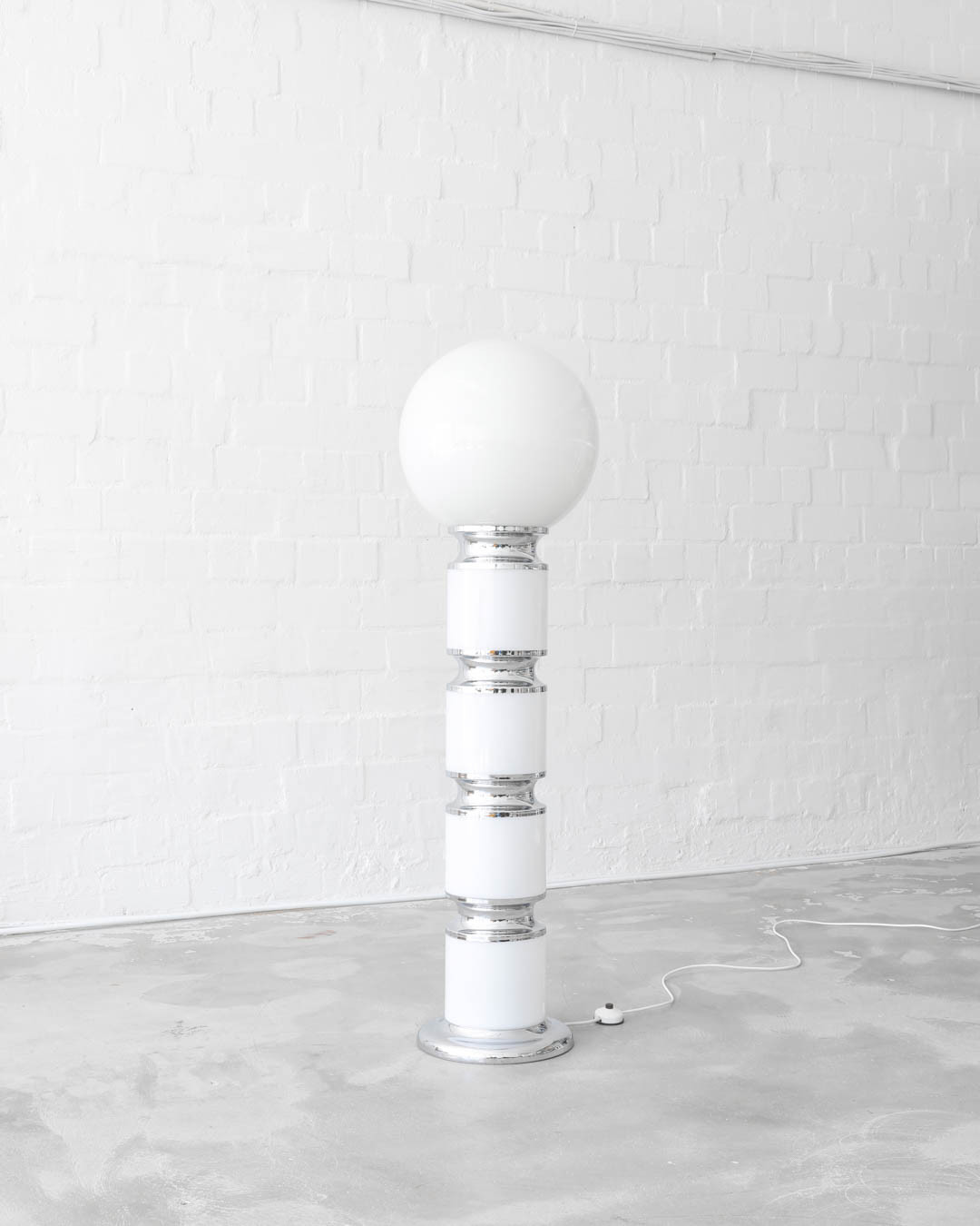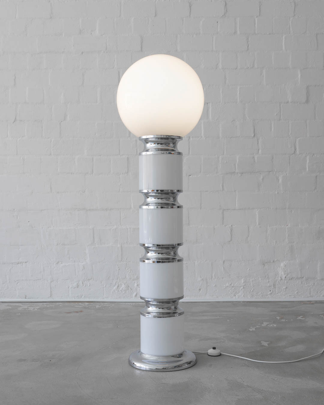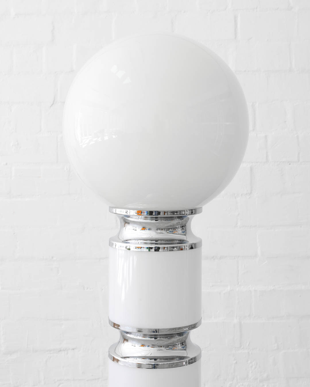Space Age lamp featuring a large glass globe combined with chrome and acrylic elements. The lamp offers three lighting modes, allowing the globe and body to be illuminated separately or together. A true eye-catcher with a bold design.